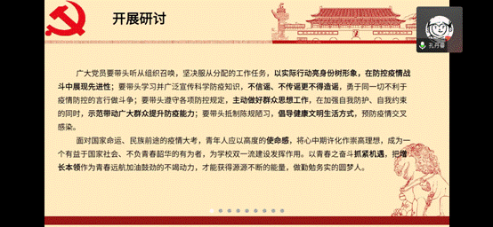 受疫情影响,虽是开展线上党日活动,但是各党员同志参与学习与讨论的热情丝毫不减。大家纷纷表示要带头听从组织召唤,以实际行动亮身份树形象,在防控疫情战斗中展现先进性。
