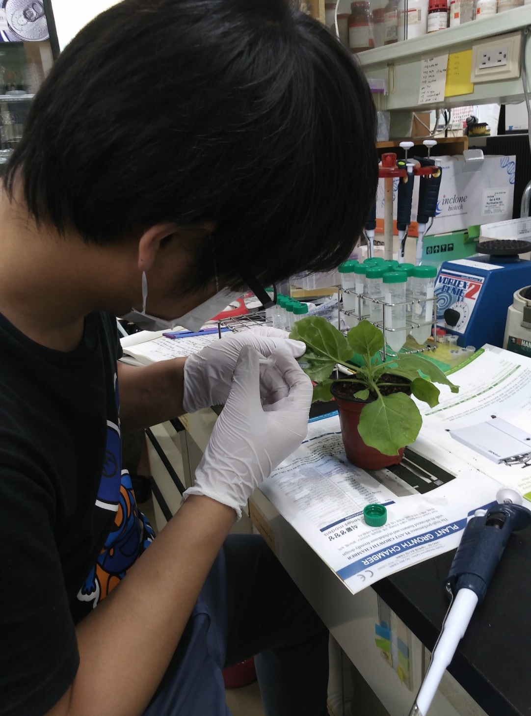 叶家保在韩国首尔大学农业与生命科学学院做烟草叶片瞬时表达转基因实验。中国青年网通讯员 叶家保 提供