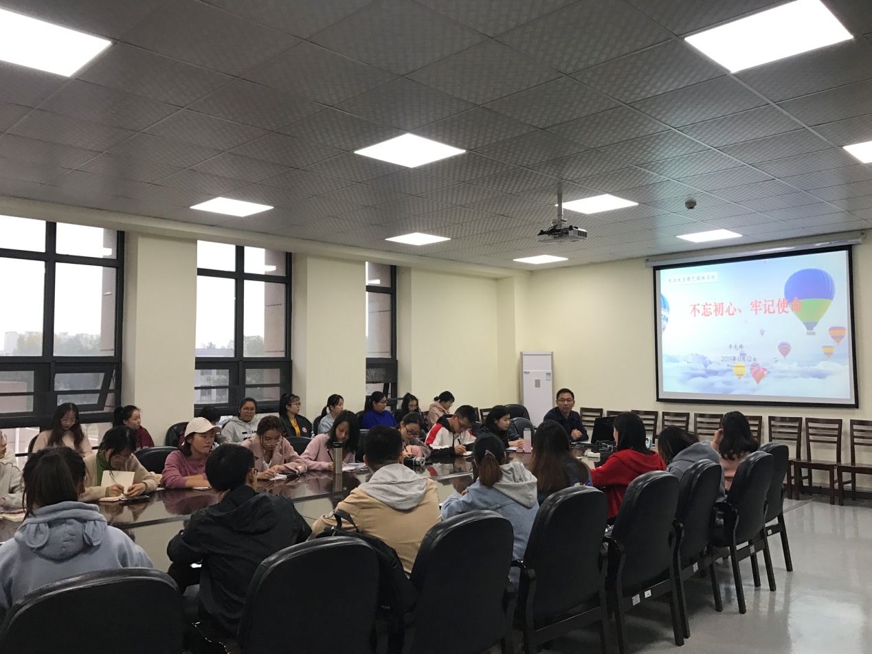 (通讯员:古青玉 黄欣茹)为深入贯彻落实习近平总书记在“不忘初心、牢记使命”主题教育工作会议上的重要讲话精神,2019年11月12日下午3:50,永利集团y23455“不忘初心、牢记使命”主题教育党课在农科大楼3002会议室开展。学院党委副书记平先锋围绕“不忘初心、牢记使命”给同学们上了一堂生动精彩的党课。到场学习的同学有永利集团y23455本科生党支部全体学生党员、2019年下半年入党积极分子与发展对象、学生会主要学生干部。