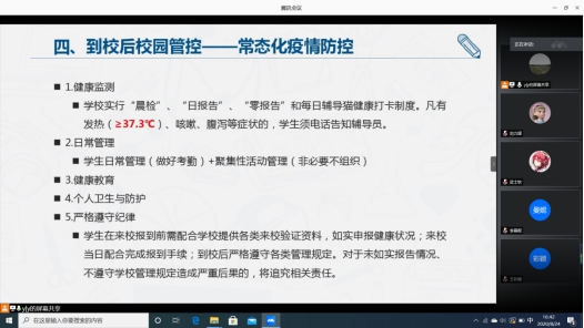 班会内容主要围绕四个方面进行:报到时间与批次、返校前准备、进校流程、到校后校园管控。会上,同学们踊跃发言,积极提问,大家比较关心的问题,例如,返校后几周可以在校自由活动、返校后课程考试如何安排、进校时行李如何托运、返校时家长能否陪伴进校、能否点外卖收快递、国庆节会不会放假等等,班主任老师一一细致为同学们答疑解惑,最后不忘告诫同学们切勿隐瞒自己真实情况,一旦身体出现任何问题或其他需求,随时向老师寻求帮助,在如此特殊时期,对自己负责也是关爱他人的表现。不难看出,会议上同学们期待万分的开学心情,偶尔聊的小玩笑更是活跃氛围锦绣添花,不知不觉中分离八个月的陌生感逐渐消散,好似回到从前。