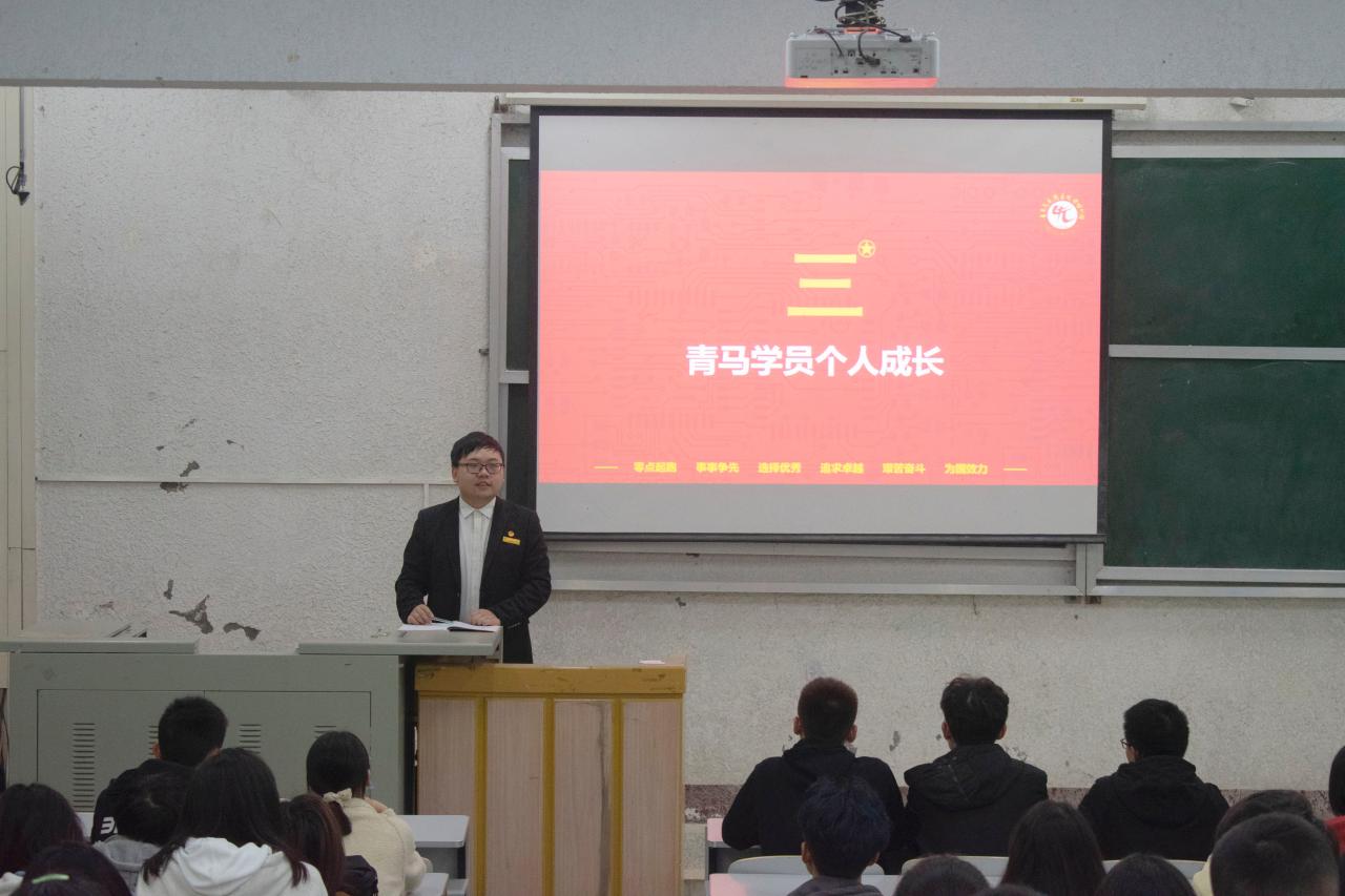 在会上,主讲人王淏林围绕青马班核心文化、基本理念、思想要求等方面进行了详细的讲解。首先,他详细介绍了青马班学员的遴选条件与流程,同时也通过视频图片展示了青马班学员积极的精神面貌。其次与同学们交流了他在青马班的个人成长收获,他说:"努力做到思想上有信仰,学习上有进步,同学中有群众基础,是青马班每一位同学的目标,在青马班你会收获更大的平台,拥有更多的机会去实现人生的追求与理想。”让同学们对青马班有了更深刻的了解。最后他就参会的学生干部的问题进行解答并给予建议,希望各位同学可以加强自身信念,坚定政治立场,认真学习马克思主义,成长为一名合格的社会主义新青年。至此,本次青马班宣讲活动圆满结束。