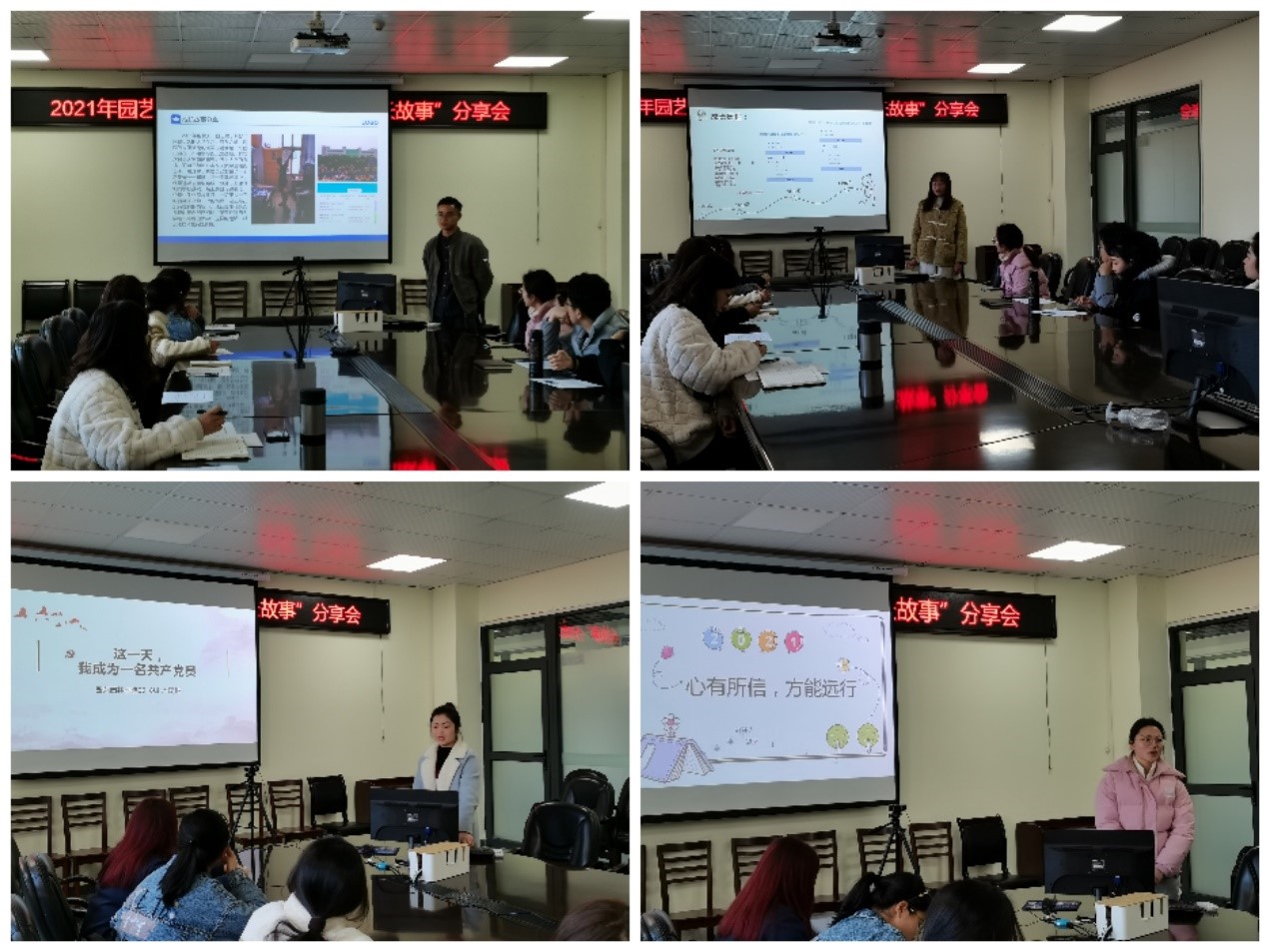 "由‘学生’到学生”该是一种怎样的心路历程呢?园林31701班的刘校同学为我们讲述了他初来长大时的迷茫,再到后来参军,最后得到锻炼和成长的故事。“军营是熔炉,它能磨炼人的意志和品质,在那里我学到了很多,也改变了我大一时对大学的看法,大学里面就应该努力学习,而不是玩”刘校同学说到。“人的一生中总会遇到很多困难,我们只有坚定目标,相信自己,才能走向成功”,园艺职31701班的王采妮同学为我们讲述了她作为一名职本生如何通过自己的努力通过英语四级的故事。而景园31801班的卢琦琳同学则为我们分享了她是如何在爷爷的影响下有了“我也要加入中国共产党的思想”,为我们带来了“这一天我成为一名共产党员”的励志故事,她说“中国共产党就像一束光,照亮了我,也将照亮更多和我一样的人”。“心有所信,方能远行”则是园林卓3180班李念蔚同学为我们带来的她在校青马班的故事,“小到精神风貌,大到思想三观,都让我看世界的格局更加开阔,也更加自由”就是李念蔚同学对她青马生活最好的诠释。