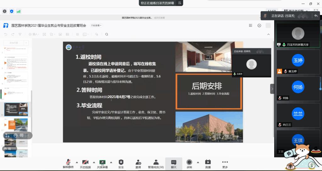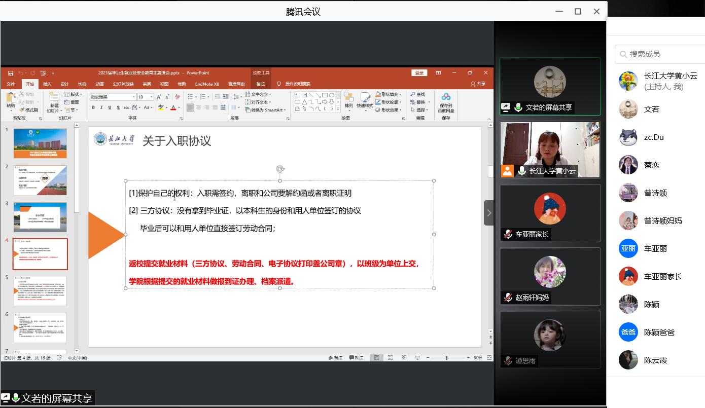 2021届毕业生主题班会由班主任组织召开,通过在线腾讯会议的方式进行。会议主分两部分。一方面是从毕业生息息相关的就业问题展开,从当前的就业情况,毕业生即将面对的就业签约、报到证办理、档案派遣等方面展开详细阐述。一是从当前的就业及考研形式,引导同学们树立“先就业、再择业”的正确择业观;二是提醒毕业生学生要保护自己的权利,入职需签约,离职需要向公司索要解约函;同时注意实习期、见习期等方面的区别;三是对报到证、个人档案做了介绍,提醒同学们需要妥善保管好报到证、档案;四是介绍了团、党组织关系的转接,解答了毕业后毕业生组织关系何去何从的问题。