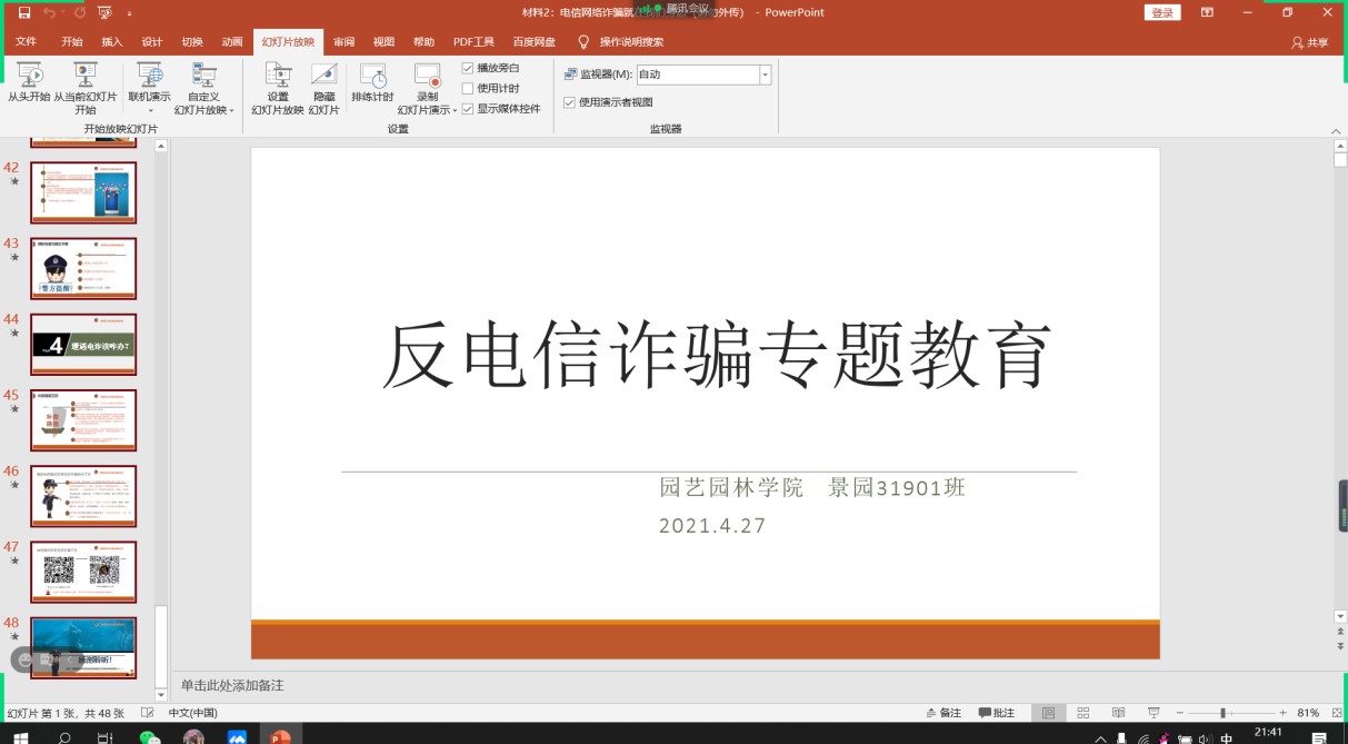 学院组织召开形式多样的“防范电信诈骗专题教育”班会或线上会议。各班班会讲解发生我们身边的电信网络诈骗典型案例,举例自己朋友身边的真实案例说明了诈骗的危险性,且最近电信诈骗较为活跃,教育引导学生提高防范电信诈骗的意识,提醒大家保持警惕,注意财产及自身安全。