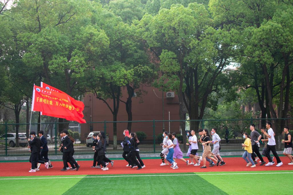在活动的最后一项议程中,电信学院党委副书记郭启炜向我院传授了“千班唱红歌,万人健康跑”旗帜,我院万人健康跑正式开始,此次升旗仪式在全体同学绕操场健康跑两圈后结束。