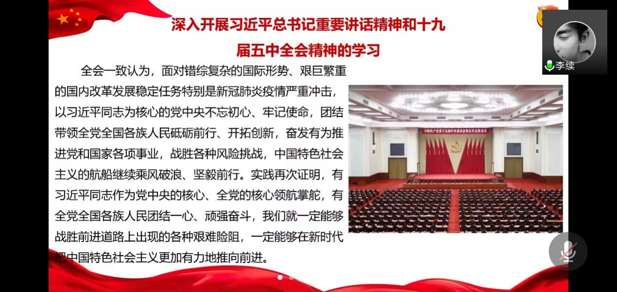 “十四五”时期是我国在全面建成小康社会、实现第一个百年奋斗目标之后,乘势而上开启全面建设社会主义现代化国家新征程、向第二个百年奋斗目标进军的第一个五年。各班团支部组织学习了《习近平总书记论青少年成长(第三辑)》,中国共产党第十九届中央委员会第五次全体会议公报,习近平:关于《中共中央关于制定国民经济和社会发展第十四个五年规划和二〇三五年远景目标的建议》的说明等重要材料。本院师生积极响应,积极参与,各团支部学习小组通过“学、思、传、行”,将学习贯彻习近平总书记重要讲话精神和十九届五中全会精神同本院师生学习、工作实际相结合,开展线上线下讨论,交流学习心得,学深悟透、融会贯通,确保学习收到实效。