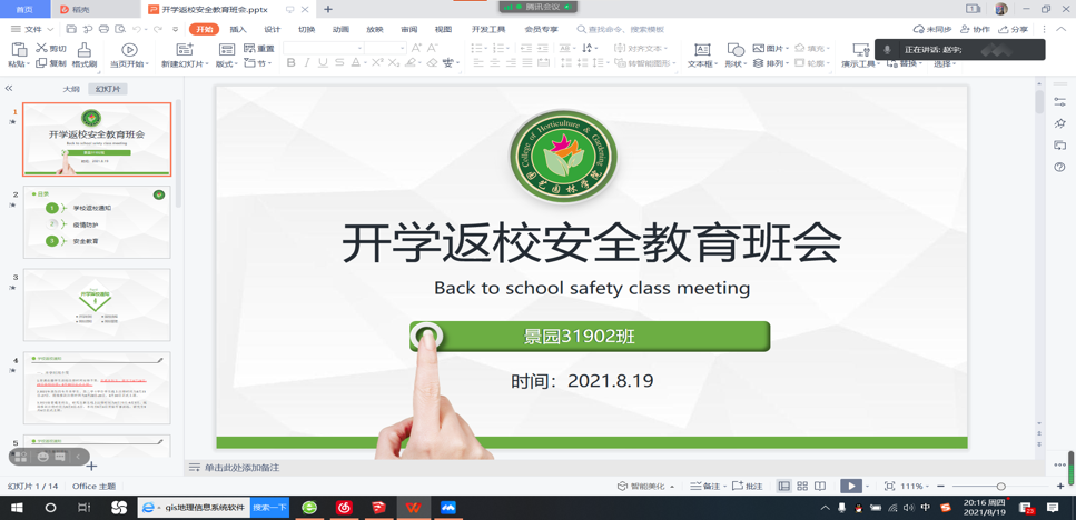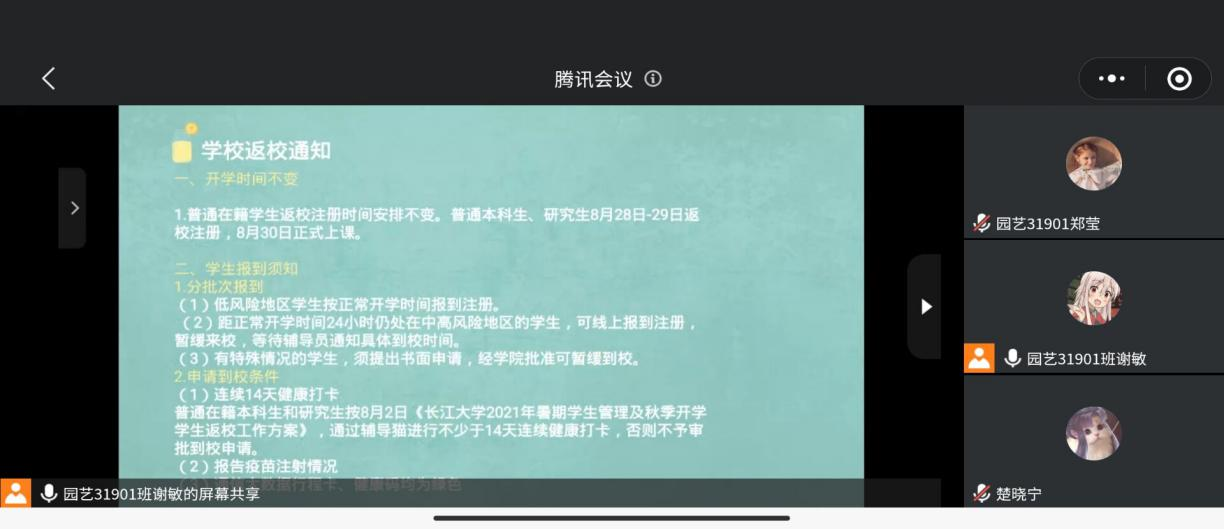 班会结合学校返校通知、疫情防护、安全教育三个部分对学生进行讲解。按照学校返校通知文件,向同学们强调了开学时间、学生报到须知、到校流程、以及返校后的管理工作等,保证每个同学都能正常返校。在疫情防控方面,强调每位同学要减少外出做好防护,并带领同学们学习了荆州市新冠肺炎疫情防控指挥通知。会议上强调:返校需14天连续正常打卡、健康码绿色、行程码绿色,中高风险区域流调无异常,学院审核同意后方可正常返校,同时,要求申请延迟返校的同学按要求办理相关手续,严格审批。最后是关于返校安全教育,从多个方面出发,强调了疫情防护安全防溺水安全,交通安全,个人财产安全等。