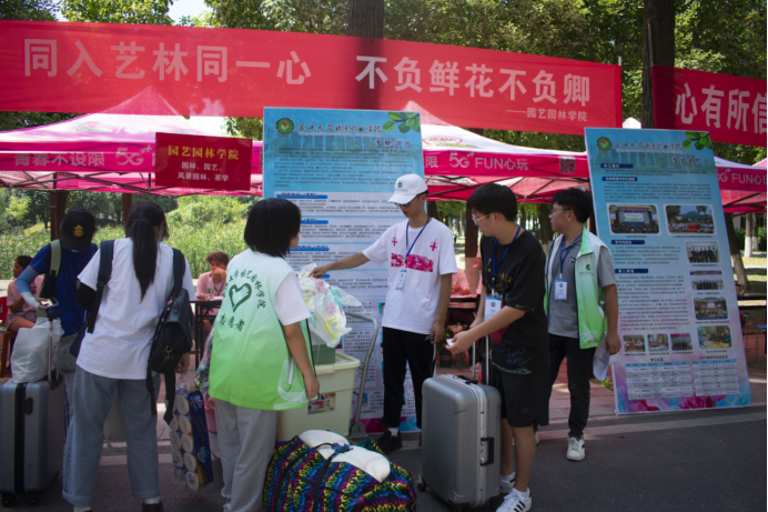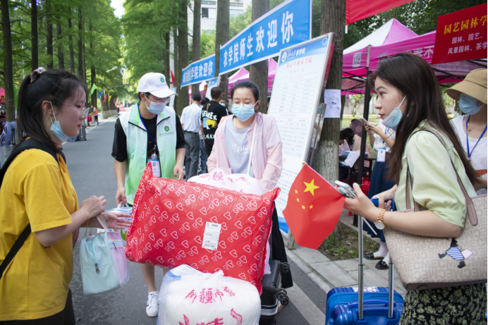 在迎新接待点,新生们交上录取通知书、身份证、准考证,查验身份信息,领取档案后,我院迎新志愿者会帮助新生们运送行李,引领新生们办理入住寝室的相关手续并领取军训服装。