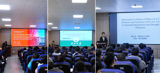 活动开始,三位主讲人依次上台汇报:来自生命科学学院食品科学与工程专业的硕士研究生徐涛报告了他的《基于纳米脂质——马铃薯淀粉复合体系稳定的Pickering乳液研究》;我院风景园林专业的硕士研究生刘瑞成报告了《球囊霉素相关土壤蛋白通过调节生长素对枳生长发育产生的影响》;来自农学院遗传育种专业的博士研究生蒋伟就其《植物14-3-3蛋白的分子进化和大麦14-3-3A调控气孔响应干旱的分子机制》的研究进行了汇报。