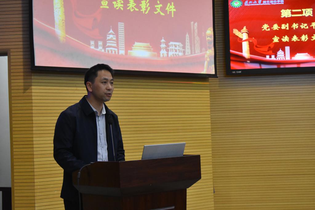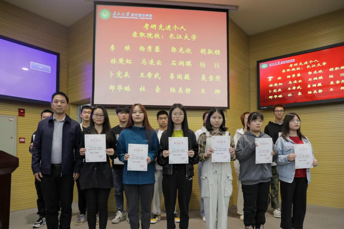 大会在庄严隆重的国歌中拉开帷幕,党委副书记平先锋宣读表彰文件,接着由郭晓华、吴宗军、平先锋、丁兴禄四位老师为考研先进个人颁奖并合影留念。