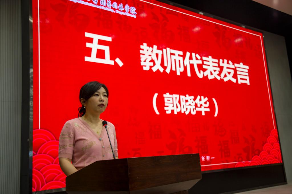 九点整,典礼在庄严的国歌声中拉开了序幕。首先郭晓华老师代表全体教师对毕业生表达了深深的祝福,邀请毕业生们记得常回家看看,依依不舍之情溢于言表。