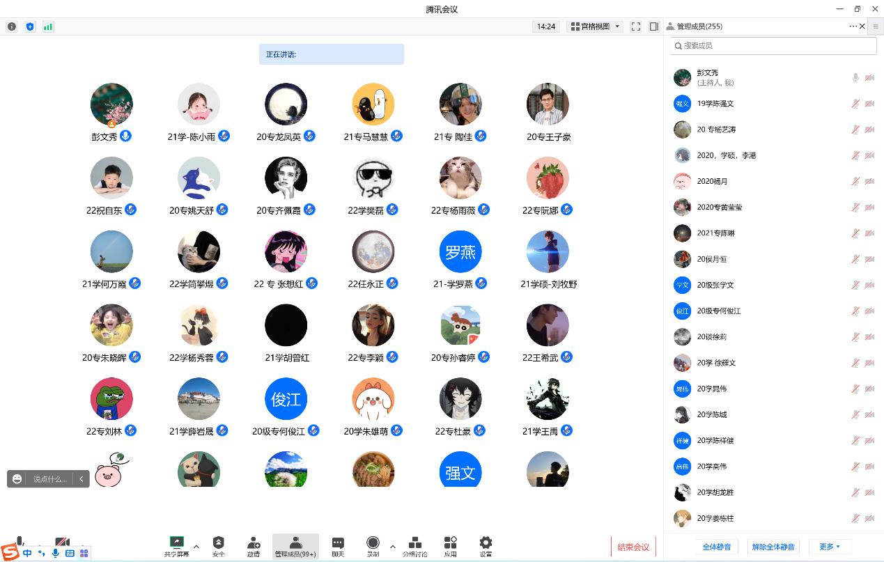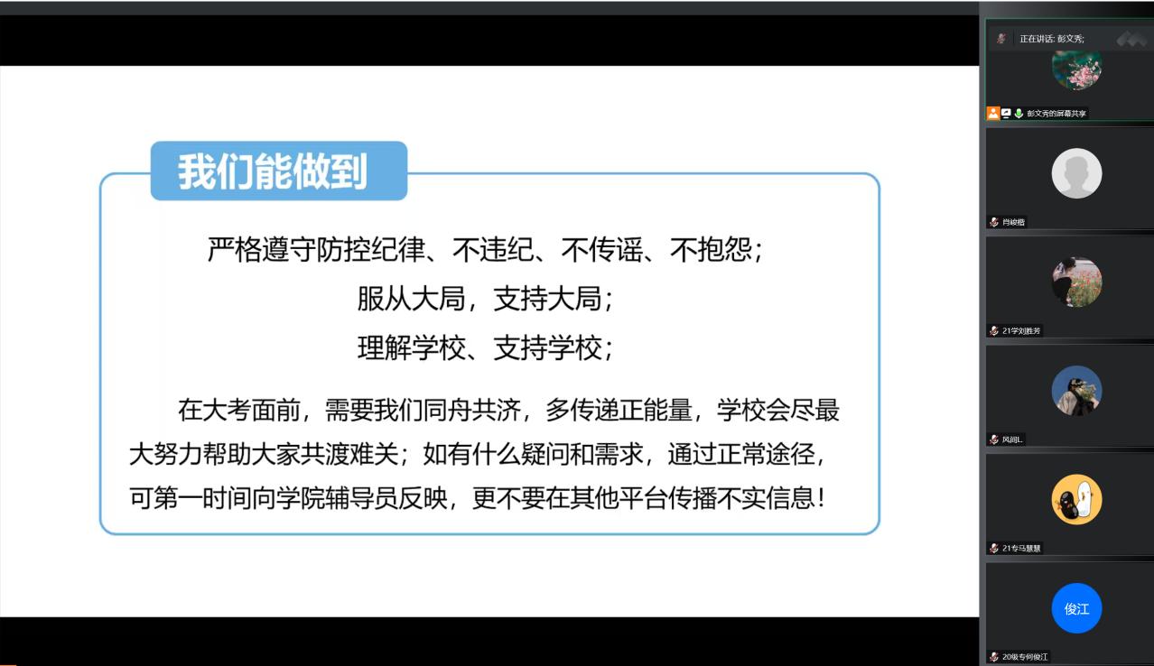 会议结束后,彭老师与参会同学线上交流,了解学生提出来的问题和困难,积极解答并给予帮助,最后呼吁同学们严格遵守防控纪律、不违纪、不传谣、不抱怨,服从大局,支持大局,理解学校、支持学校。