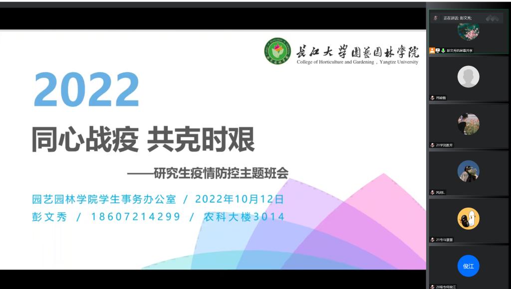 (通讯员:邓琦琪)2022年10月12日晚上19:00,我院于腾讯会议召开同心战疫,共克时艰——研究生疫情防控主题会议。会议由学工办主任彭文秀老师主持,我院全体研究生线上参与了本次会议。