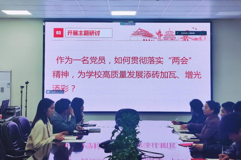 最后开展主题研讨环节各位党员同志讨论作为一名党员,如何贯彻落实两会精神,为学校高质量发展添砖加瓦、增光添彩。同志们积极发言表达自己的看法,相互学习相互讨论。最后全体党员起立进行党员誓词的重温,牢记初心使命,坚定为人民服务的信念。