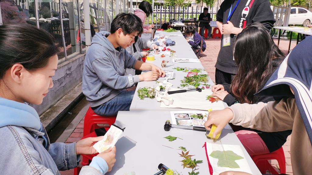 4月7日早上8:30,院研究生会成员到达活动现场布置活动场地,9:00活动正式开始,参与人员前往接待区了解活动内容,签字领取素白帆布包以及材料和工具,前往制作区开始创作,参与人员可根据自己的审美以及想法,将不同的植物拓印在帆布包上,创作出独一无二的作品。作品完成后,工作人员发给参与者祝福卡片,由参与者写下祝福语,将卡片置于帆布包中,活动参与者也可凭作品在接待区领取自己喜欢的纪念礼品。最后,参与人员将作品交给工作人员,作品以及祝福卡片将在活动结束后由工作人员捐赠至荆州市自闭症康复中心,将其赠送给自闭症儿童,为自闭症儿童带去一份温暖。