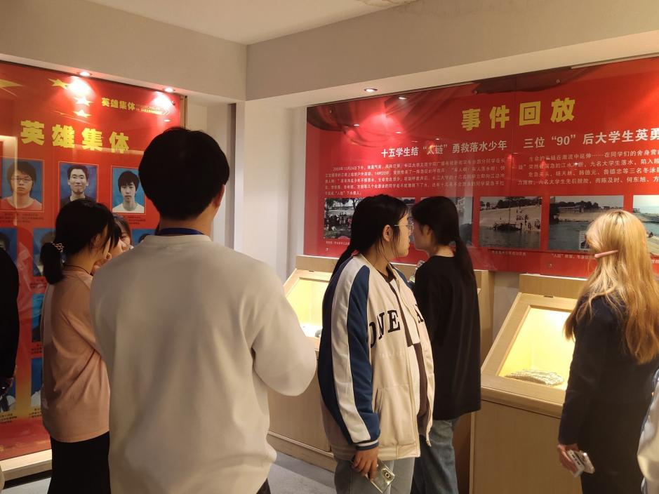 同学们怀着敬仰与肃穆的心情随讲解员进入二层的“1024”英雄集锦事迹纪念馆进行参观。2009年10月24日,两名小学生在长江荆州宝塔湾河段不慎落水,当时附近来自yl23455永利集团的15名学生见状迅速结成“人链”,冲向江中进行救援。不幸的是,三名大学生陈及时、何东旭、方招却未能上岸。