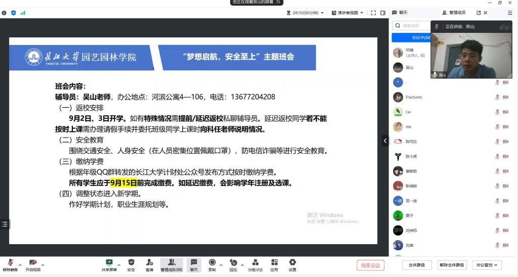 会议过程中,吴山老师向同学们传达了新学期开学注意事项,包括报到时间安排、学费缴纳等内容,同时对同学们进行安全教育,围绕交通安全、人身安全等,尤其是防诈骗安全教育,针对近年来学校多起诈骗案例,帮助学生提高对诈骗的认知,增强对诈骗的风险防范意识。