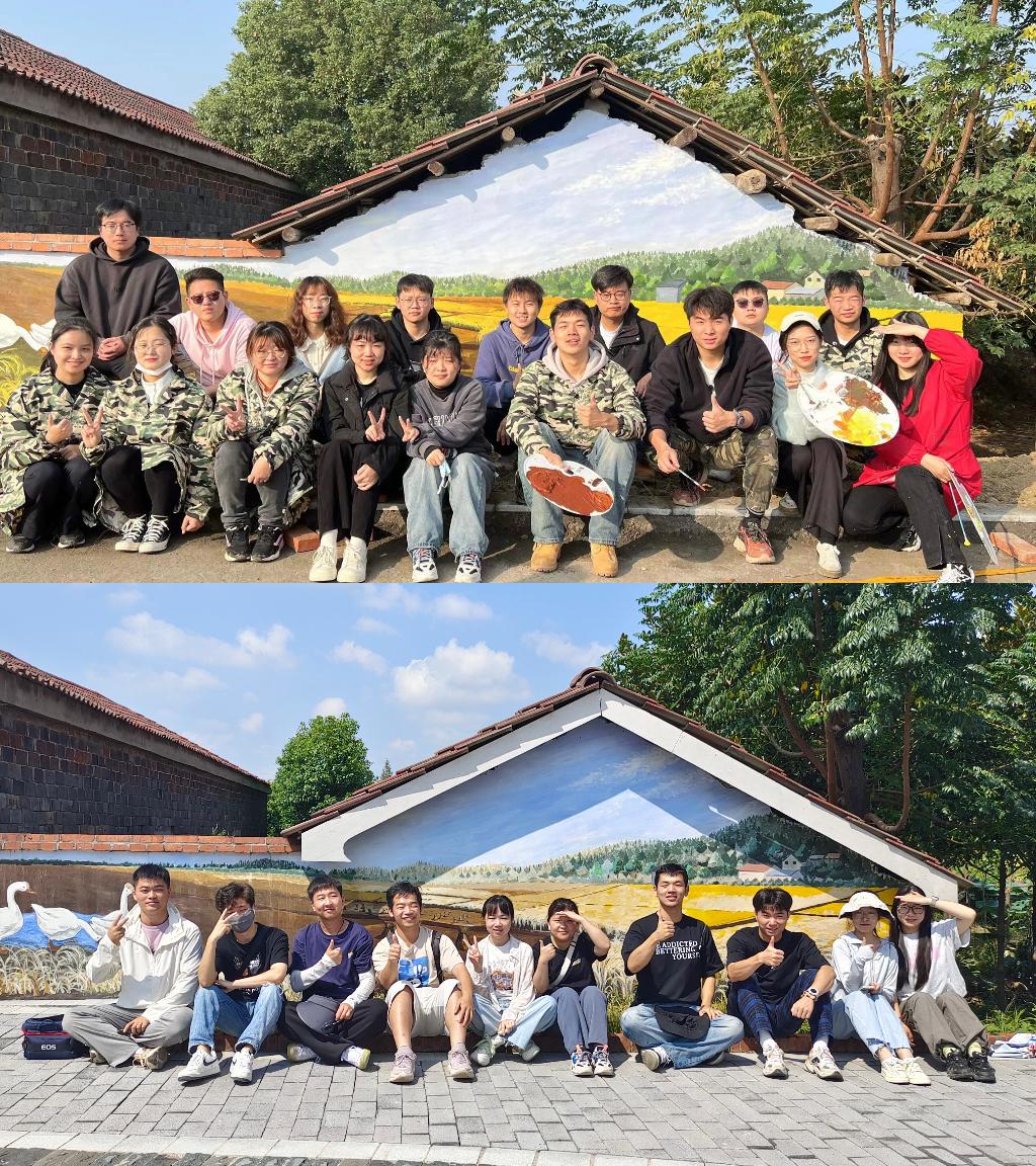 调研结束后,师生前往旁边的丰收村回顾之前在此开展的共同缔造工作,并向村民们表示慰问。在共同缔造现场,低年级学生认真学习上一届完成的景观落地成果;而参与了丰收村共同缔造活动的研究生们故地重游,回顾自己的劳动成果,昔日艰苦但美好的回忆再一次浮现眼前,同时也唤起了同学们作为风景园林人助推乡村振兴的初心使命。