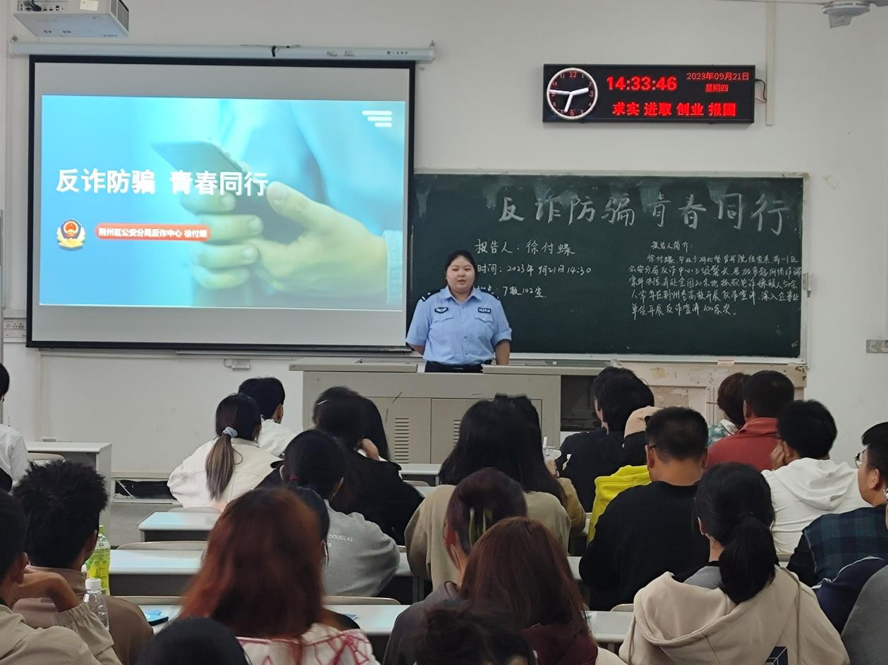 (通讯员:代熙本)为进一步增强学生防范电信网络诈骗的安全意识,有效遏制电信网络诈骗犯罪的发生,增强学院学子自我信息财产保护能力。9月21日,我院于西校区7教102教室开展“反诈防骗,青春同行”反诈骗宣讲。本次主讲人是荆州区公安分局反诈中心三级警长徐付蝶。