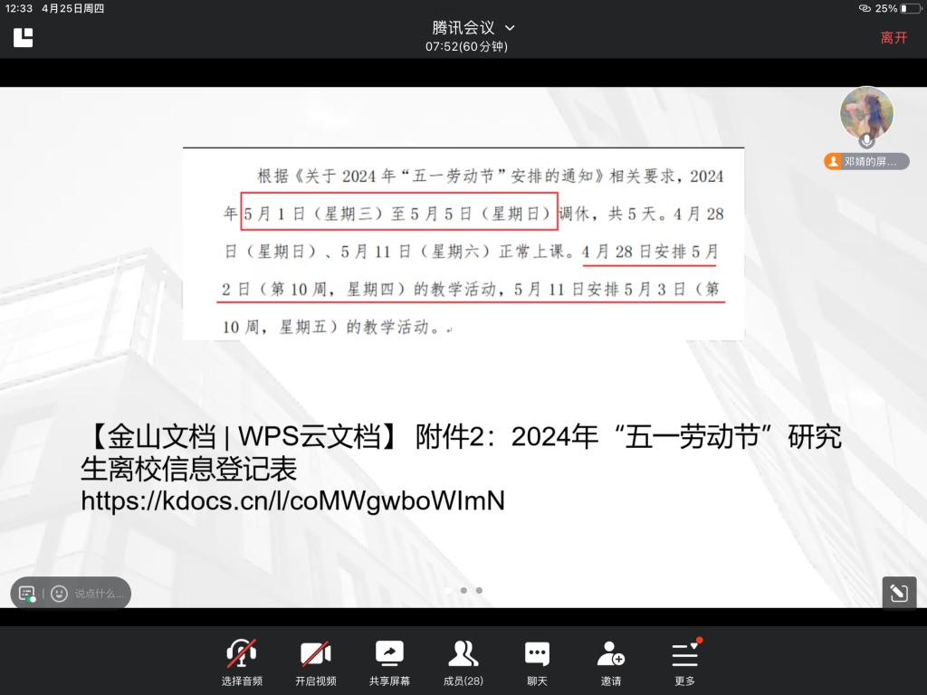 (通讯员:邓婧)“五一”小长假即将来临,为贯彻落实学校对学生假期安全教育及管理工作方面的要求,确保我院同学能够提高安全意识,度过安全愉快的假期。4月24日-4月26日以班级为单位召开研究生“五一”劳动节安全教育班会。