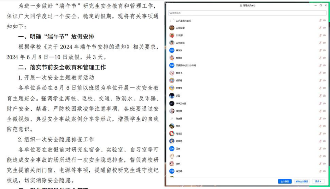 (通讯员 邓婧)在即将到来的端午节假期之际,为确保学生度过一个安全、健康的假期,我院研究生各年级于6月3日至6月6日期间,以班级为单位召开了端午节假期安全主题班会。此次班会旨在加强学生的安全意识,提高自我防护能力。