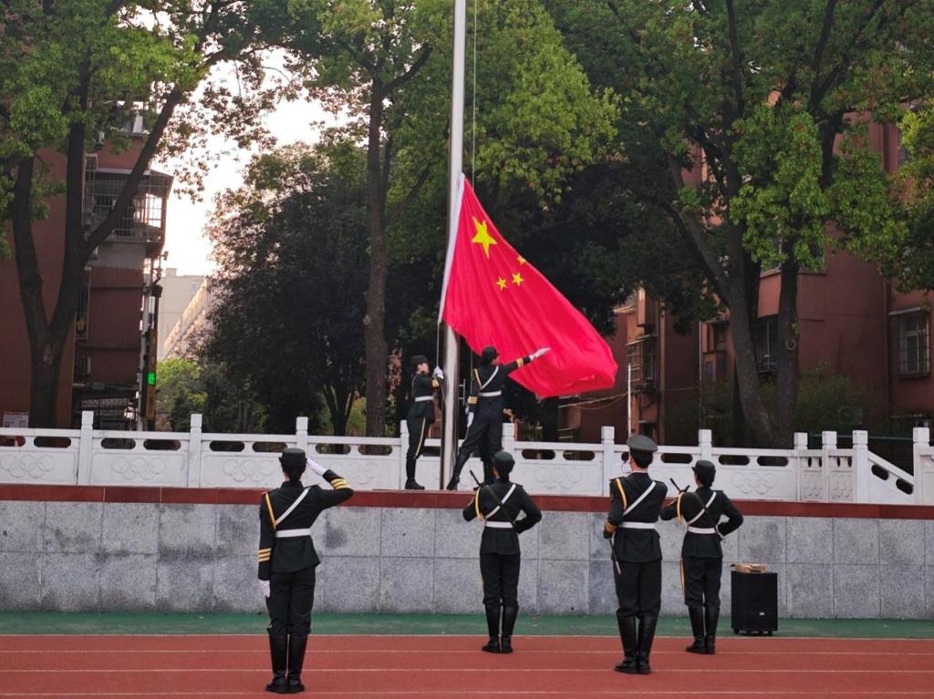 伴随着激昂的口号,护旗手们迈着整齐有力的步伐,护送五星红旗走向升旗台。国歌奏起,鲜艳的五星红旗缓缓升起,迎风飘扬。现场气氛庄严肃穆,每一位艺林学子都怀着崇敬之情,向国旗行注目礼。