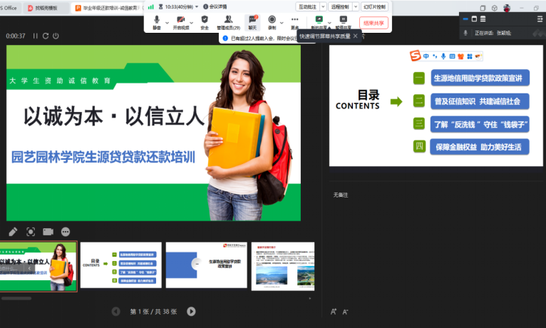 (通讯员 何璇)为切实做好毕业生助学贷款还款服务工作,6月5日,永利集团y23455通过腾讯会议平台组织召开2024届毕业生生源地贷款还款培训暨诚信就业主题教育会议。学院学工办主任张颖旭主持会议,40余名办理生源地助学贷款的毕业生参加培训。