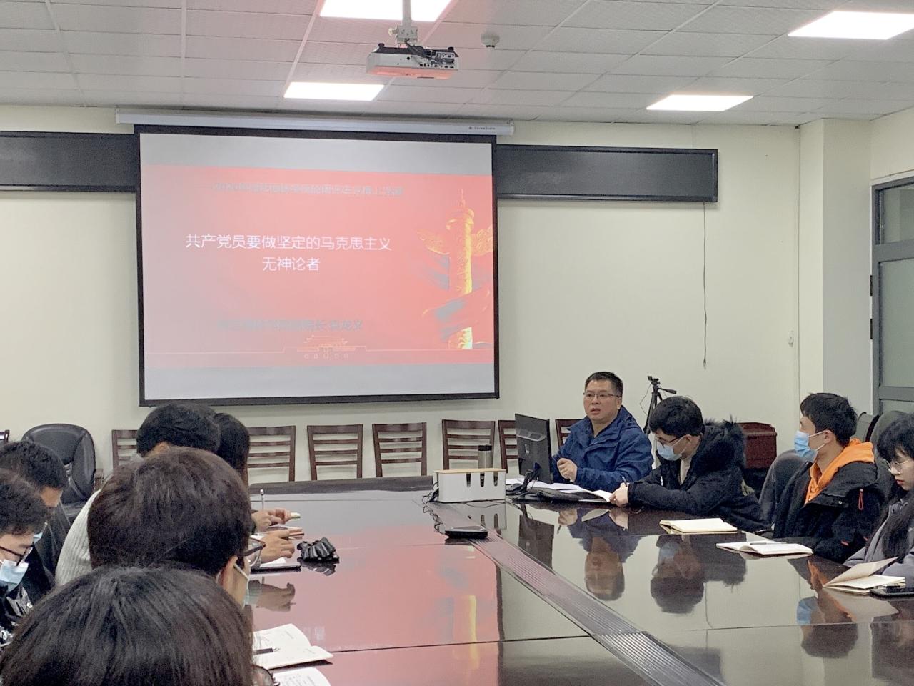 另外针对如何做坚定的马克思主义无神论者这一个重要的意识形态问题谈了个人的理解和认识,指出了共产党员为什么不能信教这是由中国共产党的性质决定的,也是由党的纪律决定的;分析了共产党员信教的危害,希望做党员学生们做坚定的马克思主义无神论者;并就如何做坚定的马克思主义无神论者提了四点要求:一是要求树立正确信仰观,旗帜鲜明反对“有神论”,二是要求树立正确的“三观(世界观、人生观、价值观)”,做忠诚的无神论者,三是要求树立科学认知观,认真践行马克思主义的无神论,四是要求行动上做无神论的执行者,在学习和科研工作中要发挥表率作用,做无神论者,做马克思主义坚定信仰者、维护者,学习和科研工作中主动作为、带头作为,为学院的学科建设和科研工作发挥了带头作用,创造性地开展工作。