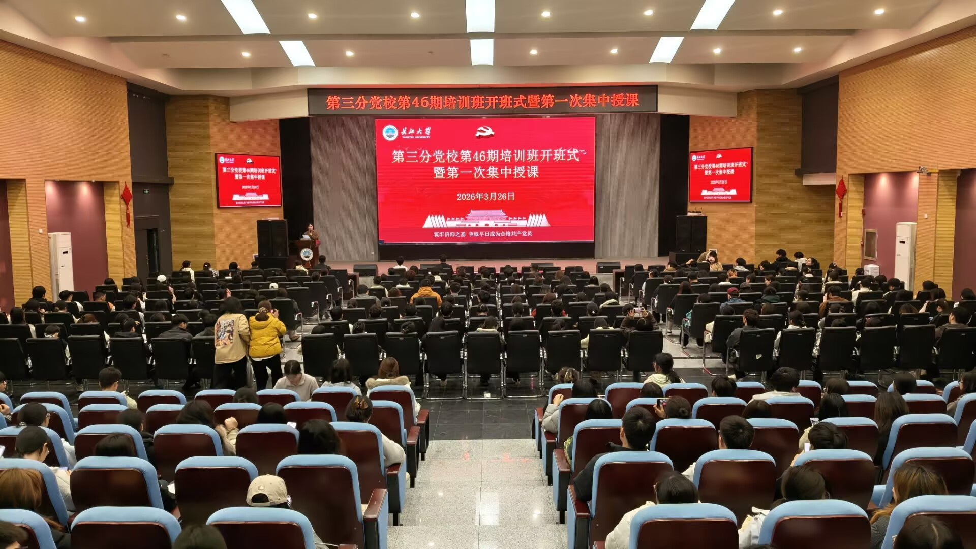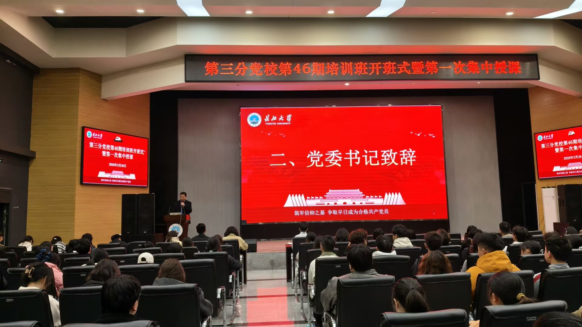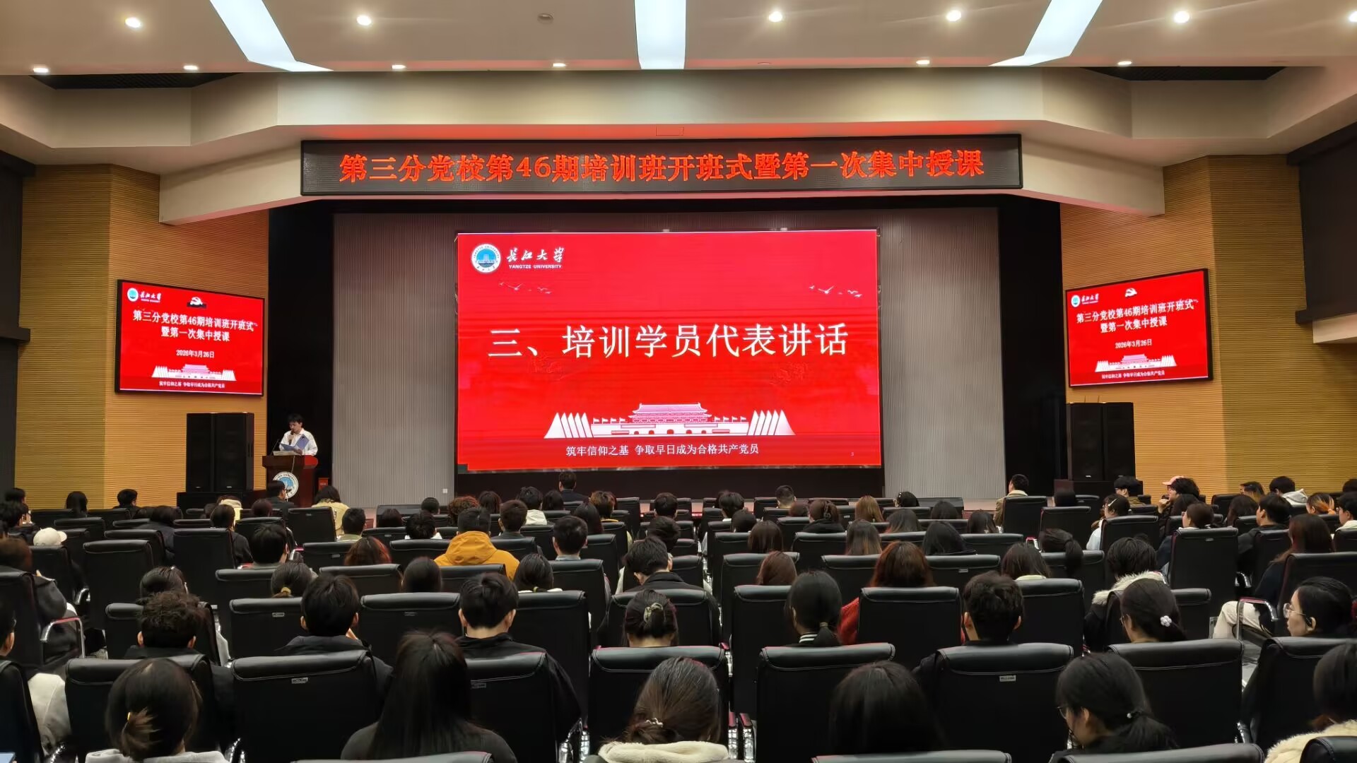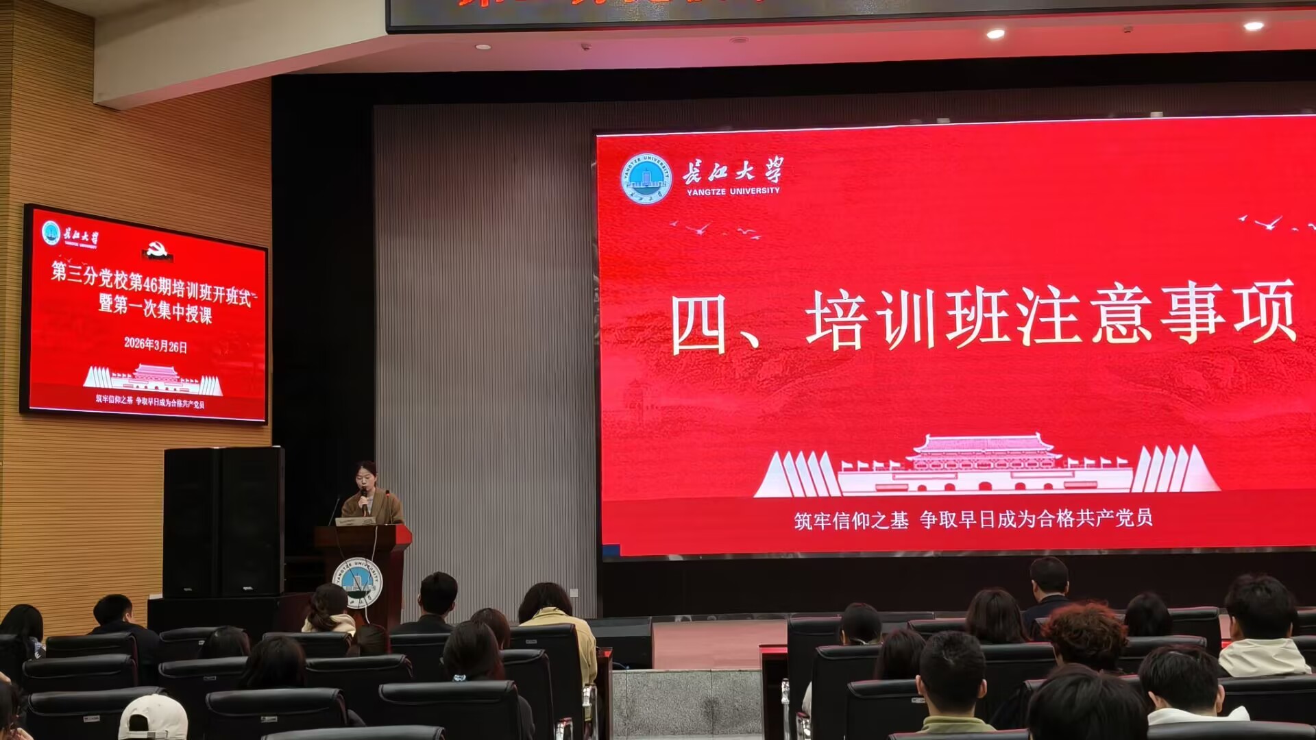 (通讯员 蒋雯静 卜文琼)3月26日晚,yl23455永利集团第三分党校第46期入党积极分子、发展对象和预备党员培训班在农科大楼1058报告厅顺利开课。培训班由永利集团y23455党建秘书卜文琼老师主持,农学院学生党建负责人唐玉婷老师、生命科学学院学生党建负责人李敏老师及西校区350余名学员参加本期培训。
