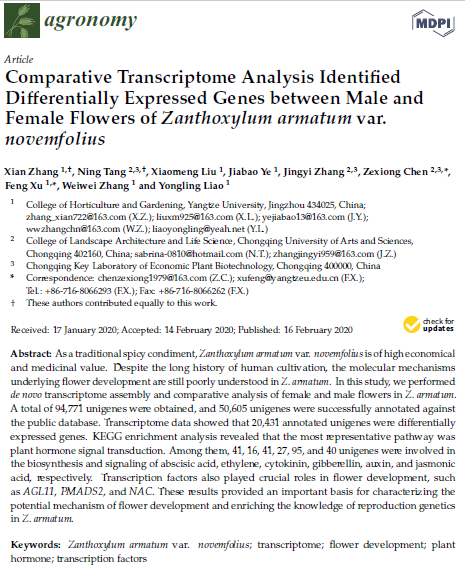 近期,我院2018级硕士研究生张娴同学以第一作者身份在MDPI旗下期刊Agronomy发表题为《Comparative Transcriptome Analysis Identified Differentially Expressed Genes between Male and Female Flowers of Zanthoxylum armatum var. novemfolius》()的论文(图1),通讯作者为该生导师许锋教授和陈泽雄教授,永利集团y23455为第一署名单位。