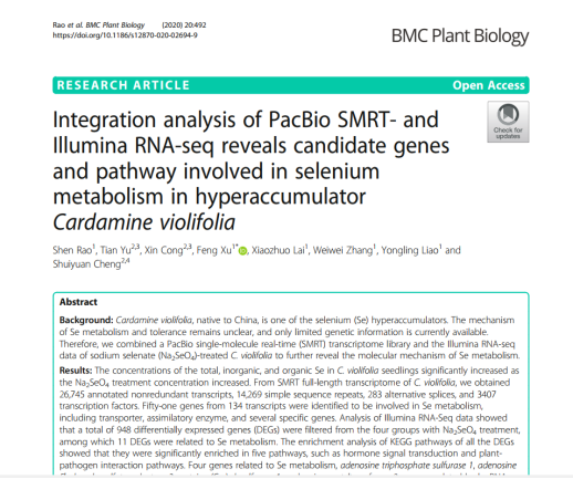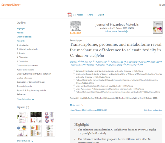 近日,我院许锋教授团队在国际著名学术期刊《Journal of Hazardous Materials》(环境科学1区,影响因子9.04)和《BMC Plant Biology》(植物学2区,影响因子3.5)上分别发表题为“Transcriptome, proteome, and metabolome reveal the mechanism of tolerance to selenate toxicity in Cardamine violifolia”与“Integration analysis of PacBio SMRT- and Illumina RNA-seq reveals candidate genes and pathway involved in selenium metabolism in hyperaccumulator Cardamine violifolia”的研究论文,揭开了超聚硒植物恩施碎米荠聚硒和耐硒的潜在机制。yl23455永利集团许锋教授为上述2篇论文的通讯作者,博士研究生饶申为这2篇论文第一作者,yl23455永利集团为第一署名单位。