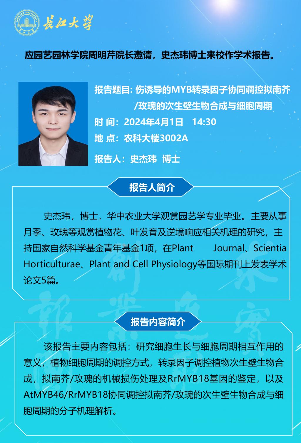 园林讲坛(2024年第三讲):伤诱导的MYB转录因子协同调控拟南芥/玫瑰的次生壁生物合成与细胞周期