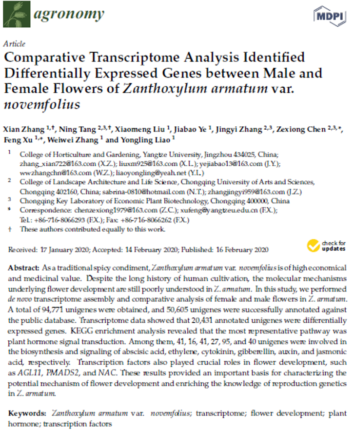 近期,我中心2018级硕士研究生张娴同学以第一作者身份在MDPI旗下期刊Agronomy发表题为《Comparative Transcriptome Analysis Identified Differentially Expressed Genes between Male and Female Flowers of Zanthoxylum armatum var. novemfolius》()的论文(图1),通讯作者为该生导师许锋教授和陈泽雄教授,永利集团y23455为第一署名单位。