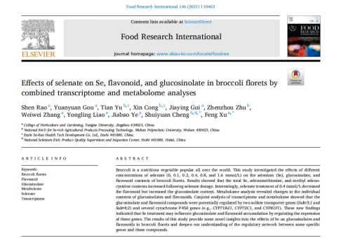 (通讯员 刘晓梦 桂嘉营)2021年5月,我中心2018级博士饶申在国际权威期刊《Food Research International》(农林科学1区,影响因子6.48)上发表题为“Effects of selenate on Se, flavonoid, and glucosinolate in broccoli florets by combined transcriptome and metabolome analyses”的研究论文,揭开了硒影响西兰花重要活性成分黄酮和芥子油苷的机制。该论文第一作者为饶申博士,通讯作者为许锋教授,第一署名单位为yl23455永利集团。