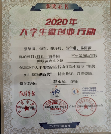 (通讯员 刘晓梦 向娟)202156日,我中心2020级硕士研究生蔡绍博组建团队,并作为团队负责人,以《株山一亩茶园——百年茶场民宿化的脱贫致富之路》项目参赛,经网络初评、线上展示和现场答辩等环节,最终斩获全国“2020年大学生微创业行动银奖——乡村振兴创新奖”,这是该赛事举办7年来,我中心首次获得该类别的奖项。许锋教授为该项目的指导老师。