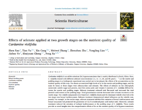 (通讯员 刘晓梦 桂嘉营)2021年6月,我中心2018级博士研究生饶申在国际权威杂志《Scientia Horticulturae》(园艺学2区,影响因子3.46)上发表了题为“Effects of selenate applied at two growth stages on the nutrient quality of Cardamine violifolia”的研究论文(图1)。饶申博士为论文第一作者,永利集团y23455许锋教授为通讯作者,yl23455永利集团为第一署名单位。