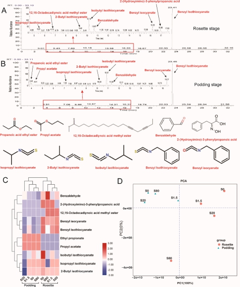 堇叶碎米荠是我国特有的一种硒超积累植物并具有丰富的营养成分,野生资源主要分布在湖北的恩施和湖南壶瓶山一带。2021年3月份,堇叶碎米荠已经被国家卫健委正式批准按照叶菜类蔬菜管理,成为合法的新食品原料。但是,富硒栽培对堇叶碎米荠的营养成分有何影响,还鲜有报道。该研究采用不同浓度硒酸钠(0,1.5,20和80 μmol/L)处理水培培养的堇叶碎米荠,发现莲座期和结荚期的堇叶碎米荠地上部硒含量均随硒酸钠处理浓度增加而显著升高,总硒含量最高可达9000 mg/kg DW,主要硒形态为SeCys2和SeO42-。不同时期的堇叶碎米荠叶绿素、类胡萝卜素、可溶性糖、可溶性蛋白、游离氨基酸和维生素C含量在不同浓度硒酸钠处理下表现出显著差异。对总黄酮、酚酸和芥子油苷含量分析研究发现,硒酸钠处理导致堇叶碎米荠的总黄酮含量在莲座期和结荚期都呈下降趋势,莲座期堇叶碎米荠的芥子油苷含量也随硒酸钠处理浓度的升高而逐步降低,而高浓度(80 μmol/L)硒酸钠则有利于莲座期和结荚期的堇叶碎米荠体内酚酸的积累,并表现出显著差异。在堇叶碎米荠的莲座期和结荚期地上部共检测出10种挥发物(图2),尽管莲座期和结荚期挥发物存在一定差异,但主要挥发性成分一致,异硫氰酸酯类物质为堇叶碎米荠特征性挥发物,其中苯甲基异硫氰酸酯约占总挥发物的97%,远高于其他成分。对比研究发现,不同浓度硒酸钠处理对两个时期堇叶碎米荠的挥发物产生影响,但80 μmol/L浓度相对其它浓度对样品的影响更明显。上述研究成果对恩施碎米荠在硒产业中的开发利用也具有很强的指导作用。