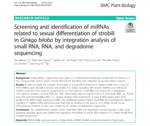 (通讯员 刘晓梦 何筱)2020年8月,我中心2019级博士研究生刘晓梦以第一作者身份在BMC Plant Biology期刊上发表了题为《Screening and identification of miRNAs related to sexual differentiation of strobili in Ginkgo biloba by integration analysis of small RNA, RNA, and degradome sequencing》(https://rdcu.be/b6sdL)(图1)的研究文章,该生导师许锋教授为通讯作者,永利集团y23455为第一署名单位。