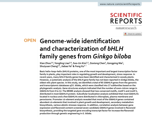 (通讯员 刘晓梦 何筱)2020年10月,我中心2020级博士研究生周仙以第一作者身份在Nature旗下期刊Scientific Reports发表题为《Genome-wide identification and characterization of bHLH family genes from Ginkgo biloba》(https://doi.org/10.1038/s41598-020-69305-3)的论文(图1),通讯作者为许锋教授,永利集团y23455为第一署名单位。