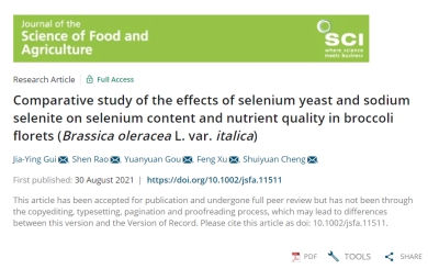 2021年9月,我中心2020级研究生桂嘉营以第一作者身份在国际著名权威杂志《Journal of the Science of Food and Agriculture》上发表了题为“Comparative study of the effects of selenium yeast and sodium selenite on selenium content and nutrient quality in broccoli florets (Brassica oleracea L. var. italica)”的研究论文。许锋教授为该论文通讯作者,永利集团y23455为第一署名单位。