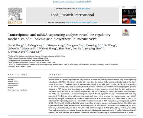 近日,我中心2021级博士研究生郑嘉瑞在国际学术期刊《Food Research International》(农林科学1区,影响因子6.475)上发表了题为“Transcriptome and miRNA sequencing analyses reveal the regulatory mechanism of α-linolenic acid biosynthesis in Paeonia rockii”的研究论文。郑嘉瑞博士为第一作者,廖咏玲讲师和许锋教授为共同通讯作者,yl23455永利集团为第一署名单位。