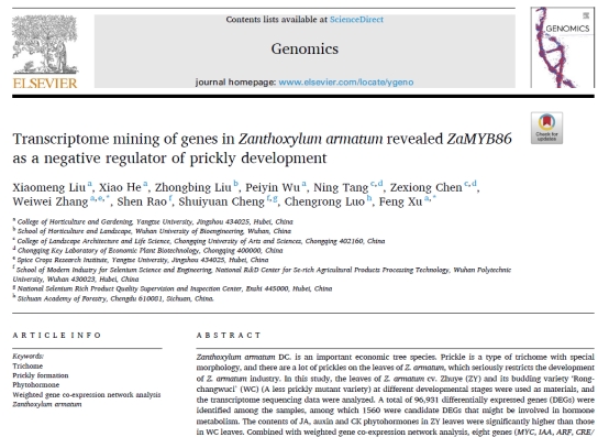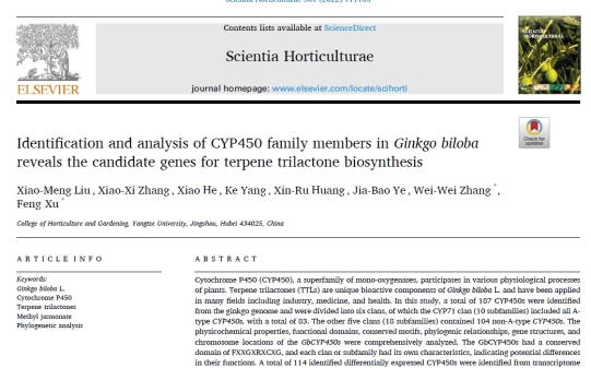 2022年5月,我中心博士研究生刘晓梦在国际学术期刊《Scientia Horticulturae》(农林科学2区,影响因子3.463)和《Genomics》(生物学2区,影响因子5.763)上分被发表了题为 “Identification and analysis of CYP450 family members in Ginkgo biloba reveals the candidate genes for terpene trilactone biosynthesis”和“Transcriptome mining of genes in Zanthoxylum armatum revealed ZaMYB86 as a negative regulator of prickly development”两篇研究论文。刘晓梦博士为第一作者,张威威副教授和许锋教授为通讯作者,yl23455永利集团为第一署名单位。