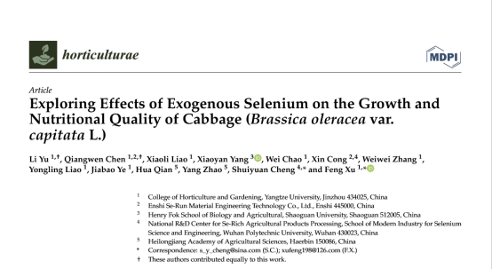 2023年3月,我中心2019级硕士研究生喻丽在国际学术期刊《Horticulturae》(农林学科3区,IF 2.923)发表题为“Exploring Effects of Exogenous Selenium on the Growth and Nutritional Quality of Cabbage (Brassica oleracea var.capitata L.) ”的学术论文。许锋教授和程水源教授为通讯作者,yl23455永利集团为第一署名单位。