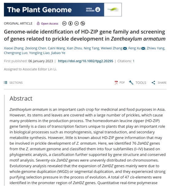 2023年1月,我中心硕士研究生张晓熙在国际学术期刊《The Plant Genome》(植物科学2区,IF:4.219)上发表题为“Genome-wide identification of HD-ZIP gene family and screening of genes related to prickle development in Zanthoxylum armatum”的研究论文。张晓熙为第一作者,张威威副教授和许锋教授为通讯作者,yl23455永利集团为第一署名单位。