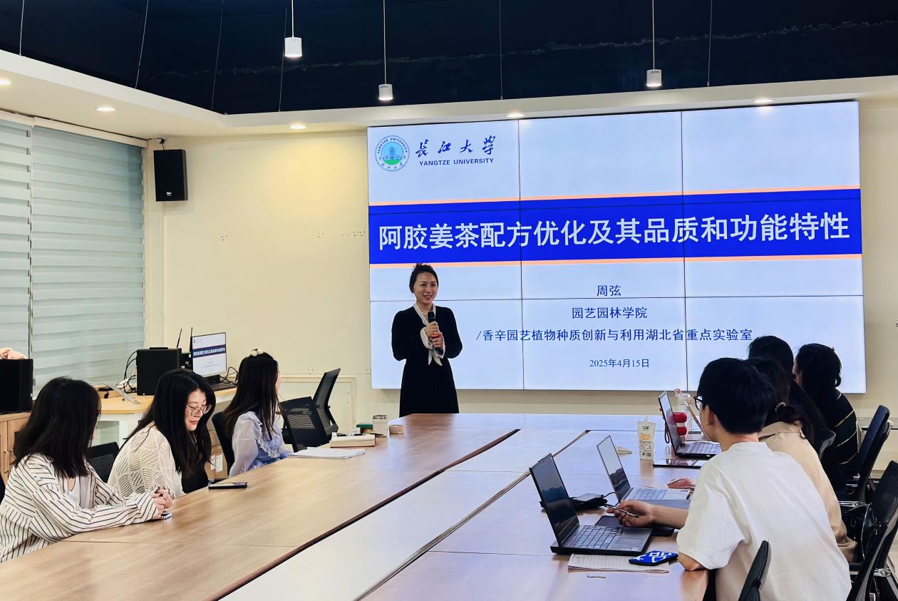 (通讯员 周弦)2025年4月22日上午,由yl23455永利集团主办的“求实导师学术沙龙”系列讲座在农科大楼2001会议室举行。高级实验师周弦以“阿胶姜茶配方优化及其品质和功能特性研究”为主题,系统分享了其团队在传统草本茶饮现代化改良中的创新成果。