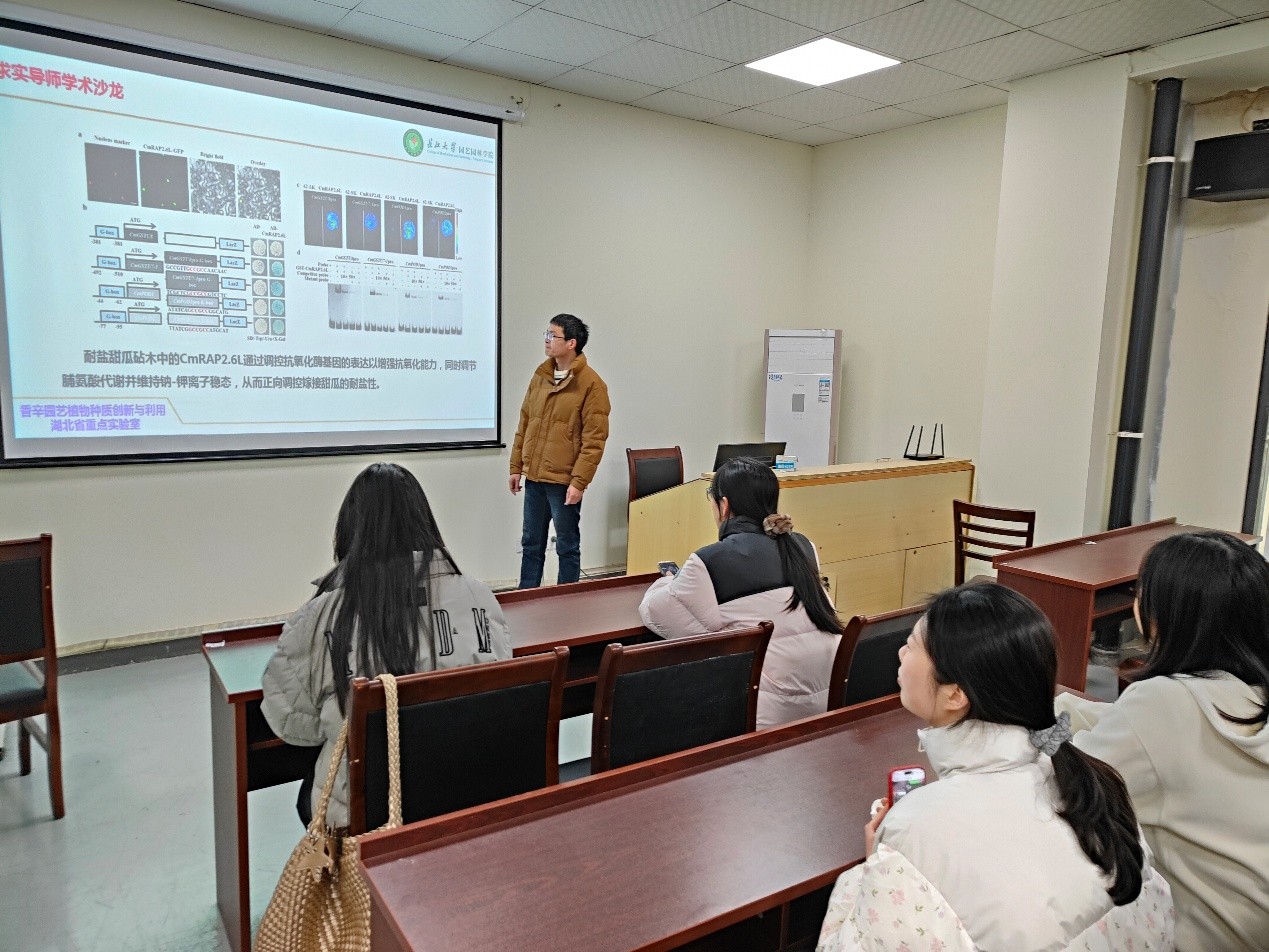 彭玉全副教授长期从事嫁接提高瓜类抗逆性的研究。讲座中,他以甜瓜为例,讲解了嫁接如何提高甜瓜的耐盐性。他近期研究发现耐盐甜瓜砧木中的CmRAP2.6L通过调控抗氧化酶基因的表达以增强抗氧化能力,同时调节脯氨酸代谢并维持钠-钾离子稳态,从而正向调控嫁接甜瓜的耐盐性。该研究为解析CmRAP2.6L在甜瓜耐盐性中的调控机制提供了重要证据,并为耐盐甜瓜品种的选育奠定了理论基础。